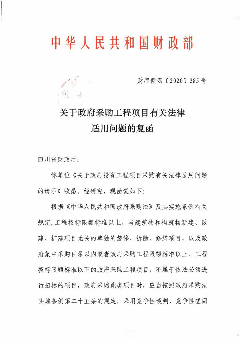 四川省財政廳: 你單位《關(guān)于政府投資工程項目采購有關(guān)法律適用問題的請示》收悉。經(jīng)研究,現(xiàn)函復(fù)如下: 根據(jù)《中華人民共和國政府采購法》及其實施條例有關(guān)規(guī)定,工程招標(biāo)限額標(biāo)準(zhǔn)以上,與建筑物和構(gòu)筑物新建、改建、擴建項目無關(guān)的單獨的裝修、拆除、修繕項目,以及政府集中采購目錄以內(nèi)或者政府采購工程限額標(biāo)準(zhǔn)以上、工程招標(biāo)限額標(biāo)準(zhǔn)以下的政府采購工程項目,不屬于依法必須進行招標(biāo)的項目,政府采購此類項目時,應(yīng)當(dāng)按照政府采購法實施條例第二十五條的規(guī)定,采用竟?fàn)幮哉勁?、竟?fàn)幮源枭袒蛘邌我粊碓捶绞竭M行采購。 財政部國庫司 2020年6月16日
